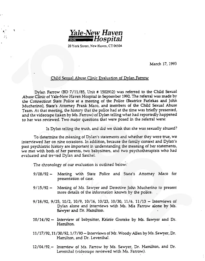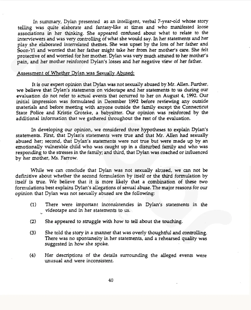 3. Probably the most important fact here: The Child Sex Abuse Clinic of Yale/New Haven Hospital performed a very thorough investigation and concluded that Dylan was probably coached or influenced by Mia Farrow, in particular to record a video that, many years later, resurfaced in the documentary “Allen v. Farrow” as the “nail in the coffin” of both the public’s doubt and Allen’s legacy. Yale/New Haven found “no credible evidence” of the accusation. Their language is very clear: